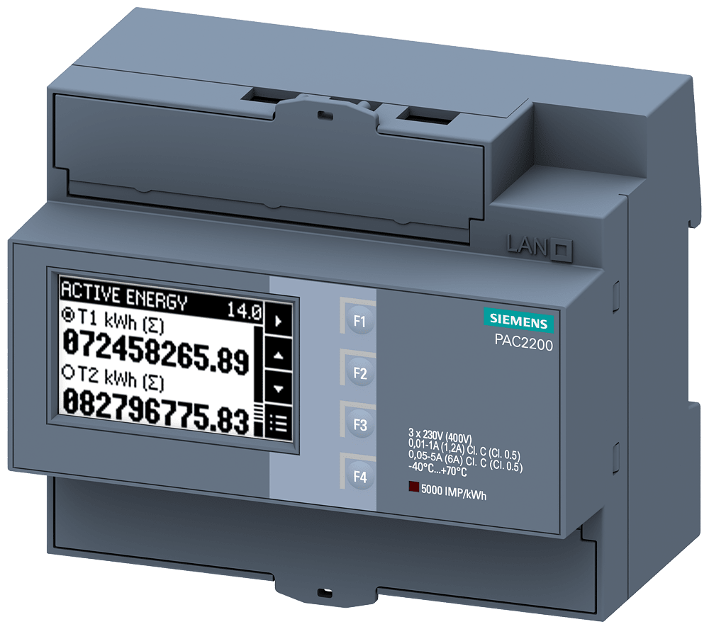 SENTRON, dispositivo di misura, 7 km PAC2200, LCD, L-L: 400 V, L-N: 230 V, 5 A, Apparecchio per montaggio su guida DIN, trifase M-Bus, energia apparente / energia attiva / reattiva, autoalimentato, morsetto a vite Contatore di energia SENTRON 7KM PAC2200per la misura del fabbisogno energetico in reti monofase e trifase, ad es in impianti industriali, edifici funzionali, uffici e appartamenti in condomini. I dispositivi di misura dellenergia 7KM PAC 2200 con gamma di funzioni ampliata, rilevano in modo preciso, riproducibile e affidabile i valori di energia per alimentazione, partenze elettriche o singoli utilizzatori attraverso la misura con trasformatori o diretta fino a 65 A. Essi forniscono non solo informazioni complete sulla vostra installazione elettrica e sulla distribuzione dellenergia ma anche valori di misura importanti per la valutazione dello stato dellimpianto. Per lulteriore elaborazione dei dati di misura i dispositivi sono facilmente integrabili, grazie alle loro molteplici possibilità di comunicazione, in sistemi sovraordinati di automazione e di gestione dellenergia tramite Modbus TCP, PROFINET, PROFIBUS, Modbus RTU e M-Bus. I dispositivi di misura 7KM PAC sono disponibili in diverse varianti, adatte a soddisfare le vostre esigenze. SENTRON PAC - Gli specialisti nellacquisizione di valori di misura.