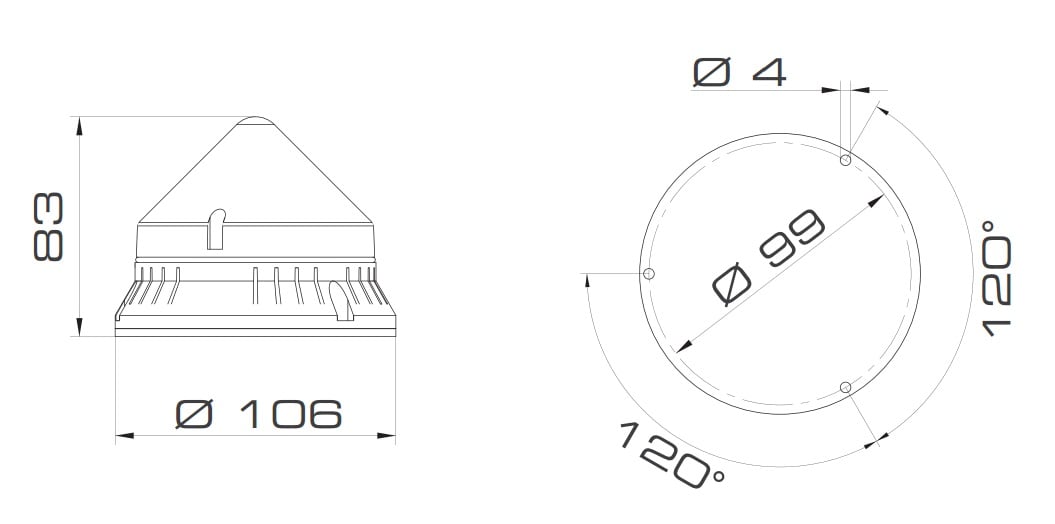 Dispositivo luminoso per applicazioni industriali a bordo macchina con diametro 90mm, versione a luce fissa con lampada a filamento (non fornita). Base in ABS, cupola in policarbonato. Fissaggio tramite viteria standard non fornita. Lampada a incandescenza con attacco Ba15d 10W.