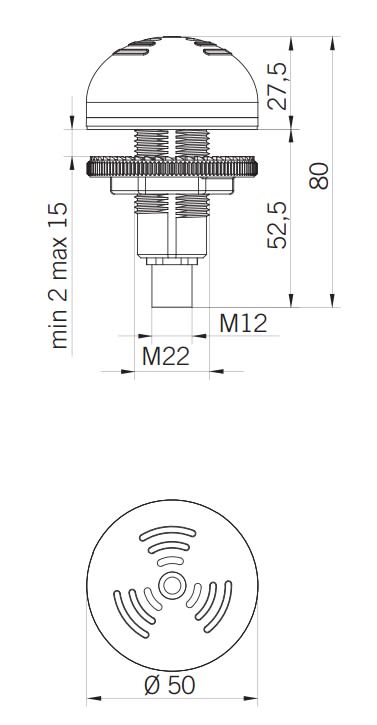 Buzzer piezoelettrico multifunzione, sviluppato con tecnologia multicanale. P50 A consente sette modalità di allarme selezionabili tramite contatti elettrici indipendenti. Versione con connettore a montaggio rapido QC M12. Policarbonato autoestinguente ad alta resistenza agli impatti, guarnizione o-ring in EPDM presente sulla cupola e guarnizione in poliuretano sulla base. Può essere installato a pannello tramite foro Ø22 e bloccato con l’anello di chiusura fornito. Connessione elettrica tramite connettore a montaggio rapido (QC M12 4 PIN). Circuito acustico con buzzer multitensione. Sette suoni disponibili (Suono Continuo - Suono Intermittente Lento, Suono Intermittente Veloce, Suono Intermittente doppio, Suono Intermittente Triplo, Telegrafo, Random). Frequenza: 3500+/-100Hz