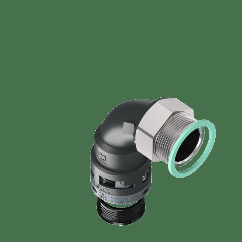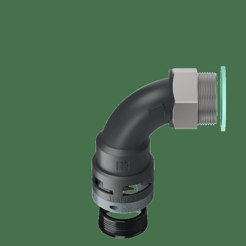 Le curve a 90° con filetto in metallo girevole facilitano in modostrutturale il montaggio di cablaggi preassemblati.La particolare costruzione senza spigoli interni permette un facileinserimento dei cavi annullando la possibilità che gli stessi venganodanneggiati.Le parti girevoli del raccordo riducono i movimenti torsionalidelle guaine aumentando la durata nel tempo delle connessionisottoposte a movimenti. Inoltre il filetto metallico assicura una piùalta resistenza alla trazione e la possibilità di essere saldamenteancorato con un comune frena filetti.Soddisfano i requisiti standard nelle applicazioni tecniche adelevate prestazioni nell’industria pesante e nel settore ferroviario.