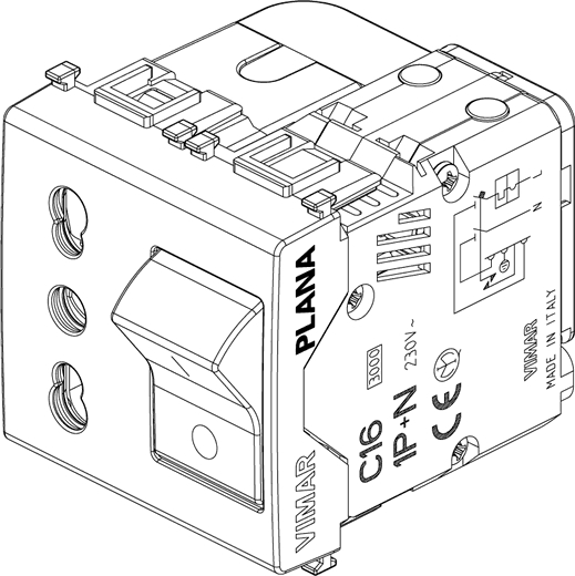Bpresa SICURY 2P+T 16 A 250 V~ standard italiano tipo P17/11, interbloccata con interruttore automatico magnetotermico 1P+N C 16, 230 V~ 50 Hz, p.i. 3000 A - 2 moduli.