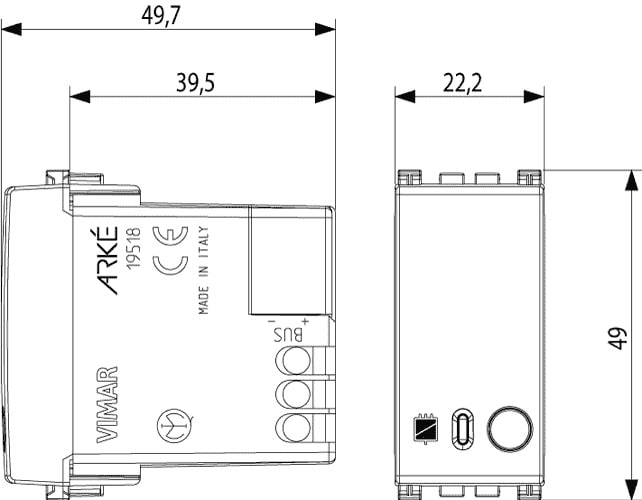 Interfaccia per comandi tradizionali. Dispositivo per il collegamento di apparecchiature elettriche di tipo ON-OFF (esempio: anemometri, sensori pioggia, sensori umidità, ecc.) o tradizionali (interruttori, pulsanti, ecc.) al sistema domotico By-me. I contatti devono essere liberi da potenziale esterno ed adeguatamente isolati; la chiusura dei contatti viene rilevata se questi rimangono chiusi per almeno 100 ms. Il dispositivo gestisce uno scenario per ogni blocco funzionale. La lunghezza massima dei cavi per il collegamento dei contatti con l’interfaccia non deve superare i 30 m. Grigio. Serie Arké.
