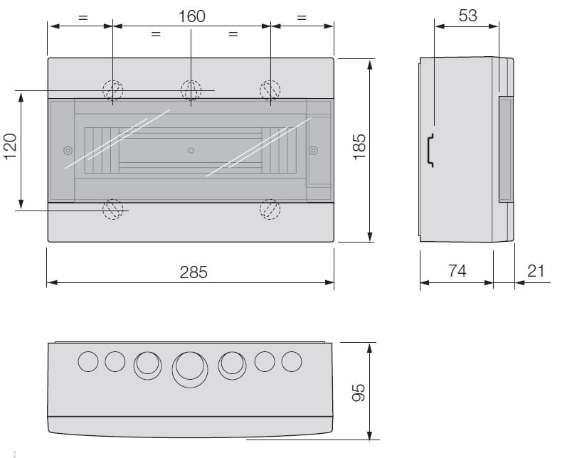 Centralino da parete IP40, con portello trasparente a cernieraverticale, 12 (12+1) moduli, prefratture sulle pareti superiore ed inferiore, grigio RAL 7035. Predisposto per portamorsettiera V51861