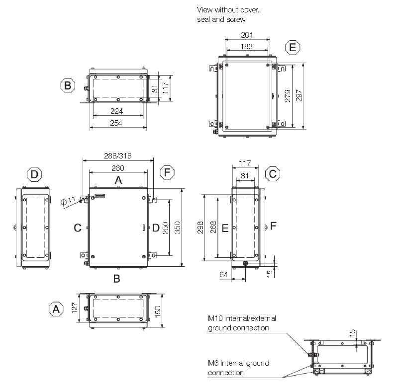 Custodia in metallo adatta all'uso in zone a rischio di esplosione. I fori per il montaggio sono posti all'esterno dell'area di tenuta stagna. Il montaggio a muro può essere realizzato utilizzando fori di montaggio o piedini di montaggio.