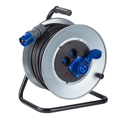Avvolgicavo manuale serie 3500versione con 2 prese universali 10/16 A 2P+T Schuko e 1 presa blu CEE 16A, con cavo e spina CEE 16A 2P+T • Corpo interno in materia plastica per la massima sicurezza • Flange in lamiera zincata • Cavalletto in tubo di acciaio, verniciato a fuoco • Freno bloccaggio bobina. Tutti i modelli sono marchiati CE, ad eccezione dei modelli forniti incompleti (senza prese e/o senza cavo), dove la marchiatura “CE” è a carico di chi li completa o di chi li mette in servizio.